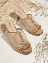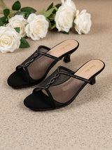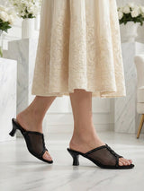 A pair of Open-toe mules featuring layered net strap detailing and mid block heel